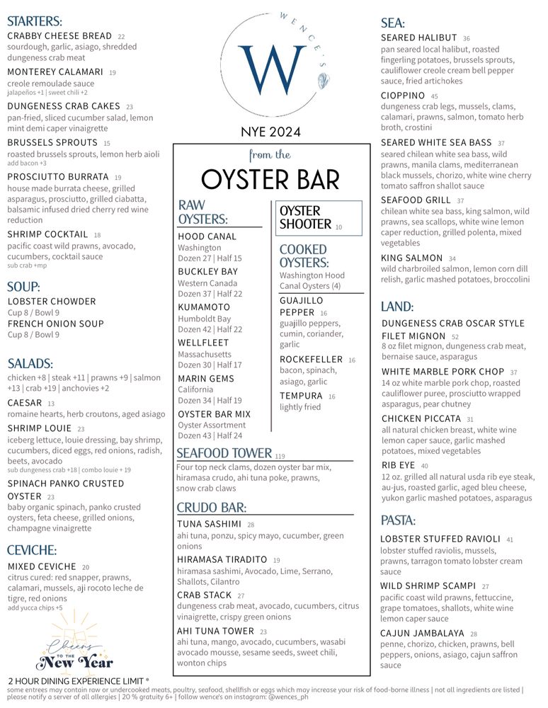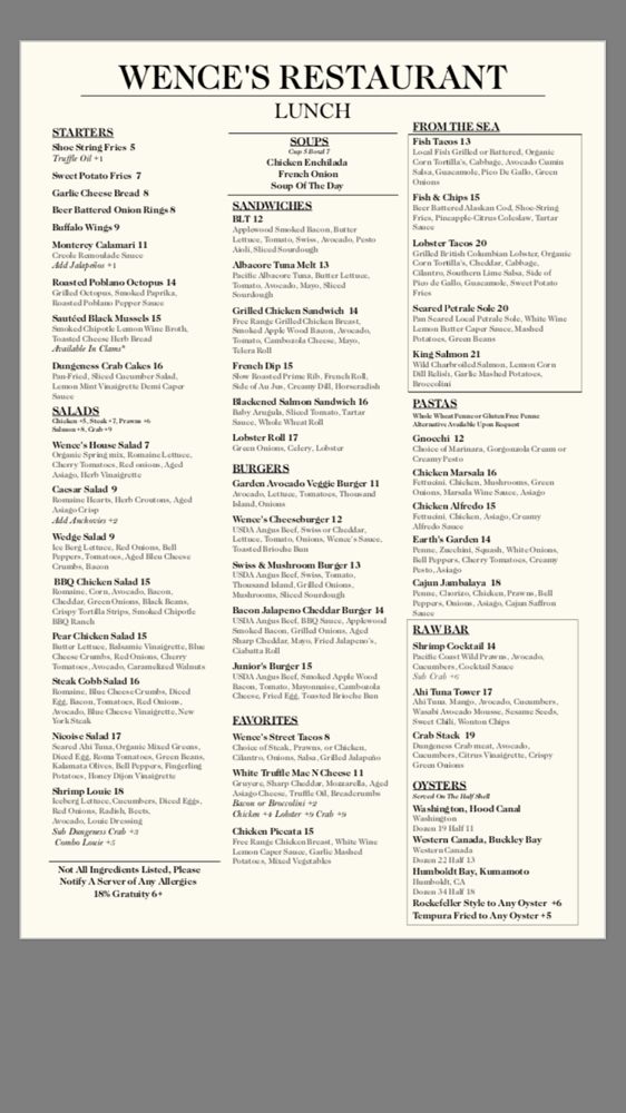 Introducing Wence’s Restaurant, a hotspot in Pleasant Hill, CA, offering a diverse menu with starters like Shoe String Fries and Coconut Prawns. Savory salads, including the House Salad and Caesar Salad, are also available. Don't miss out on the flavorful soups like Chicken Enchilada and French Onion. Customers rave about the Happy Hour Oysters and the 3-course meal deals. The ambiance is casual yet welcoming, perfect for groups or date night. Indulge in fresh seafood options like mixed ceviche and salmon, or opt for classic favorites like rib eye steak. The service is top-notch, creating a memorable dining experience. Enjoy outdoor seating with a private dining option and gender-neutral restrooms. Experience Wence’s for yourself and savor the delectable dishes with impeccable service.